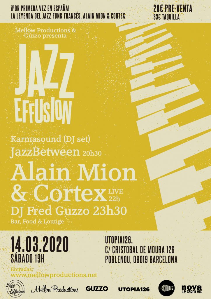 Comenzamos por JAZZ EFFUSION, presentada junto a Mellow Poblenou: una fiesta donde la nave modernista de Poblenou Utopia126 se transformará en un Club de Jazz para recibir, por primera vez en España, al legendario grupo francés de jazz funk CORTEX. Para saber más detalles sobre la fiesta pincha aquí.